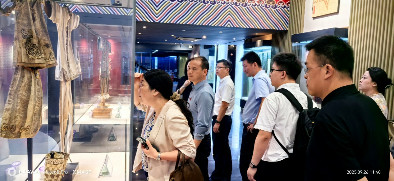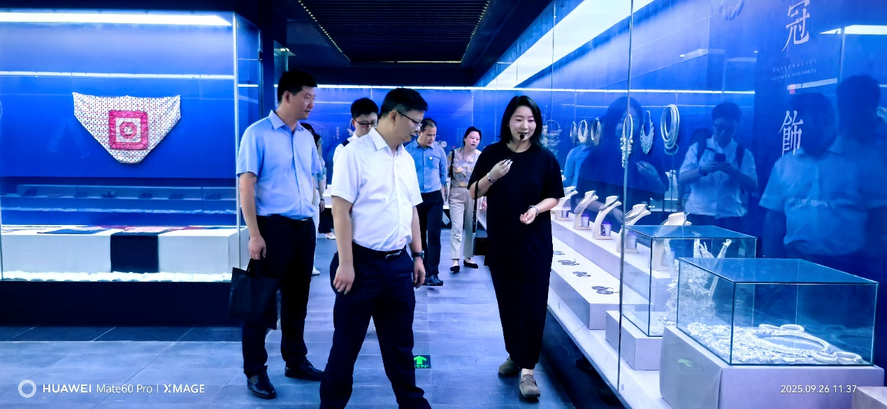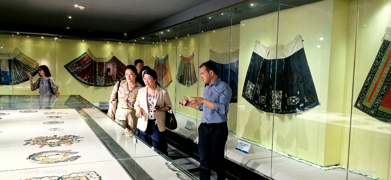 参观过程中,领导一行依次参观了我馆的历代服饰展厅、民族服饰展厅以及非遗技艺展示区。讲解员对我馆在服饰文化研究、收藏、保护与传承方面所做的工作进行了系统而详尽的介绍。领导们对我馆丰富的馆藏资源、专业的展陈设计以及在中国传统服饰文化传承与教育推广方面所取得的成果给予了高度评价。