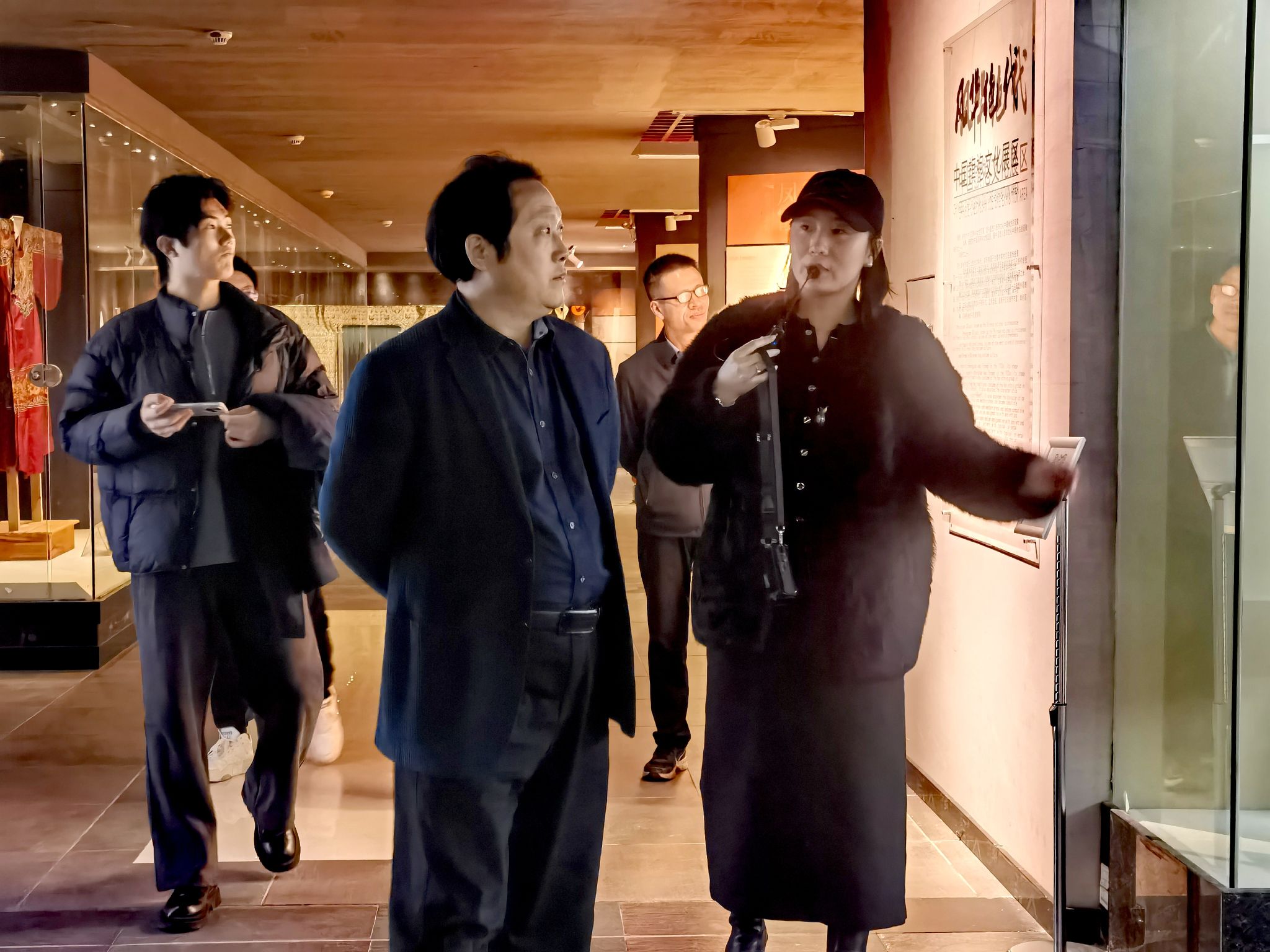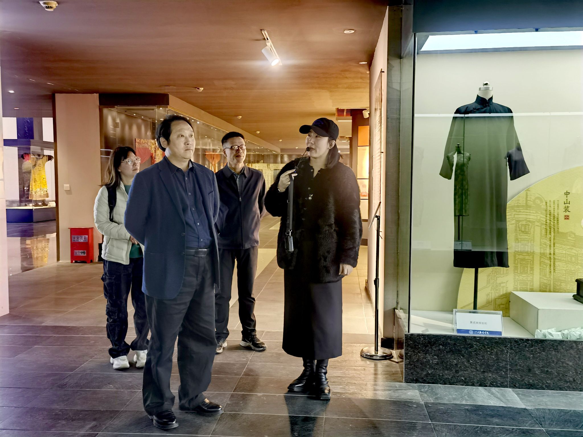 参观过程中,祝遵凌教授在我馆工作人员的陪同下,细致考察了馆内各主题展区。他结合自身在艺术设计领域的深厚造诣,就服饰纹样、工艺美学与现代设计转化的角度,与我馆人员进行了专业交流。此外在探讨传统服饰元素的当代应用与数字化传承等议题时,祝教授从跨学科的视角提出了宝贵的专业见解,为我馆服饰文化资源的创新研究拓展了思路。