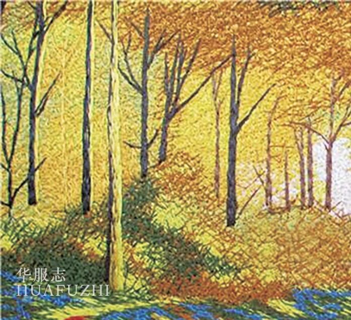 苏北绣的绣线不劈丝,多为两绒或一绒半绣。最经典的成名作品有《黄金大道》(图 6)、《红枫》