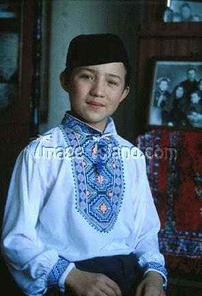 二、服饰聚焦 塔塔尔族的服饰十分别致。无论男女老幼,通常都喜欢穿一种宽袖、竖领、对襟的白色绣花衬衣,在衬衣的领口、袖口、胸前大都绣着十字形、菱形等几何图案花纹,色彩和谐、美观。在白色衬衣外,再套一件齐腰短背心。这种黑白两色的强烈反差搭配,在男子的服饰上更为普遍。男子除了衣服是这样,头上也多戴黑白两色的绣花小帽。冬季则戴一种用羊羔皮做的蓝色卷毛皮帽,下穿宽裆紧身黑裤,脚蹬长筒皮靴,外套毛皮大氅,腰束皮带,显得威武、潇洒。