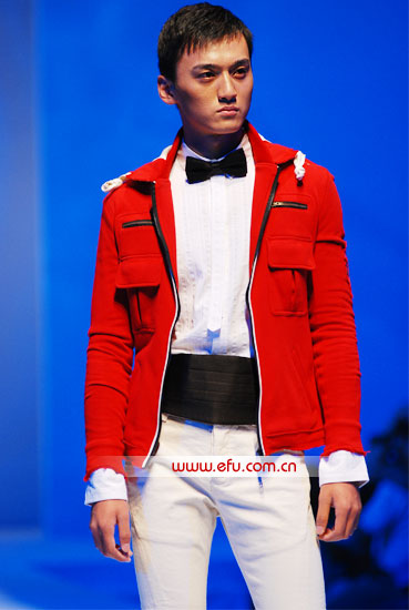 男装一直是Beauty Berry的主打,此次发布的秋冬系列男装颇有看头。带有军旅风格的裤子与正装衬衫及领结、腰封搭配,外套亮红色风帽夹克,演绎出极具冲突的风格混搭,太空感的夹克和收腰双排扣小翻领长风衣也颇具质感。另外,设计师大胆将朱红、宝蓝等饱和度较高的色彩大面积使用到男装中,以黑色压住亮色的浮躁感,演绎出精致有型的时尚感。唯一让人稍感遗憾的是男装礼服有些中规中矩,燕尾服的细节、瘦窄的廓形都是品牌一贯的风格。