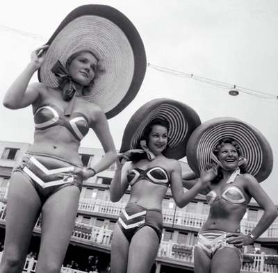 1946 年之前,比基尼只是一个地名——杜鲁门总统批准进行核弹试爆小岛的名称。那一年上半年,女人只敢穿着立领、平脚的紧紧包裹着身体的“泳衣”到海边游泳,沙滩景象是乌黑一片。