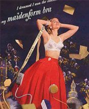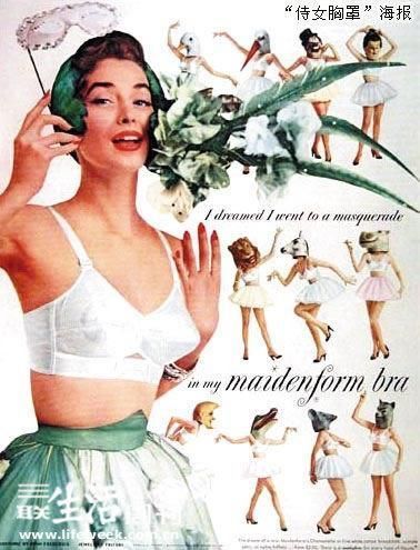 “侍女胸罩”公司(Maidenform)发迹于上世纪20年代,正值平胸浪潮,可这个公司不管风向如何变换,始终坚持一个宗旨:制造有托举功能的胸罩,塑造女性弧形曲线。1949年,侍女胸罩推出“梦想”系列广告第一篇,一个女人身着缎质胸罩,广告语为:“我梦见我戴着侍女胸罩,逛街。”此后这个系列广告一直延续,60年代性解放时期,广告语变成了:“我梦见我戴着侍女胸罩,抓住公牛的角。”美女手抓牛角的样子颇有性意味。1953年一女议员竞选阿拉巴马州州长,竞选词是:“我梦见我戴着侍女胸罩,当了州长。”后来她真选上了,有讽刺意味的是没过执政期得了乳腺癌而死。这个系列广告前后持续了20多年,成为无数卡通、贺卡,大众文化模仿与反讽的对象,改编语包括:“我梦见我戴着侍女胸罩,80天环游世界”,“我梦见我戴着侍女胸罩,因不雅暴露被捕”……“我梦见”广告揭开了胸罩的新篇章:女性再也不管男权思想和女性主义怎么标榜,而彻底臣服于时尚工业制造的假象。