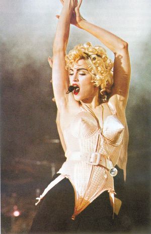 1990年,麦当娜穿着Jean Paul Gaultie设计的带锥形胸罩的、雕像般的紧身衣,开始她的“金发女郎的雄心”世界巡回演出,把“内衣外穿”的概念真正流行化,令世界瞩目。