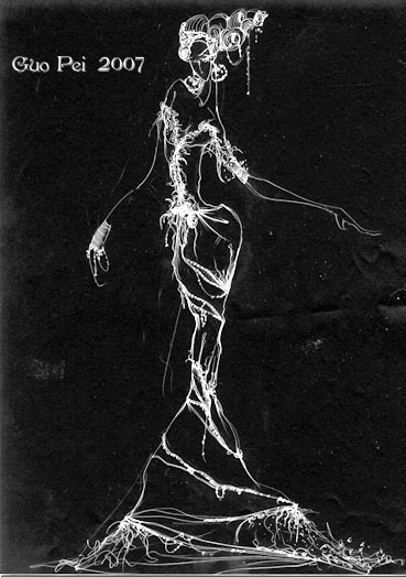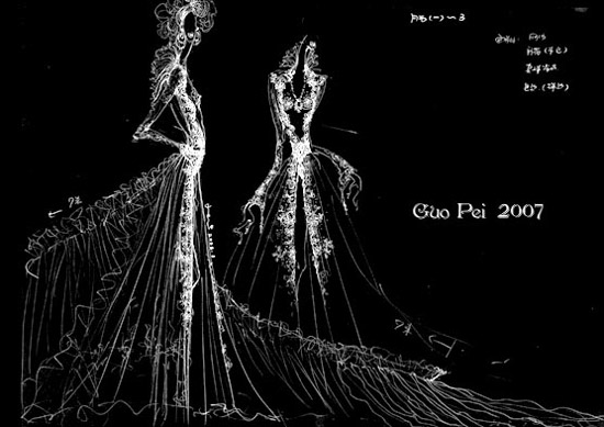 目前,我正式署名发布的作品只有《Guopei2007》、《Guopei 2008》。这两场秀受到了国内外的广泛认可,它们将成为历史,在某种程度上代表了中国当代的服装文化。每一件作品都是生动的、有灵魂的,贯穿于整个系列的主题之中。有网友提到2008年发布会中的一款有“抄袭”之嫌,那让我来解释一下。当Valentino发布的同时,我早已完成了设计的整体性构思,并且这件服装已接近成品,也试图考虑过要不要重新调整,可我的内心和对自己作品固有的坚持让我不想这么做,更何况我问心无愧。这种由心而发的自信和对设计成熟的把握无需任何更改。事实也证明了,2008年发布会所表现出的童话般的梦境、甜美无暇的幸福在每一个我投注心力的细节里绽放。相信那一刻,我的作品感动了每一个人,他们的思绪都悄然回到了久别无暇的童年。这份感动,只属于原创的力量。