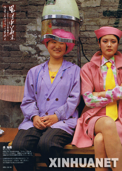 这是日本《朝日周刊》1995年采访吴海燕时刊登的一幅照片。图中右边的模特展示的是吴海燕94年设计的作品。
