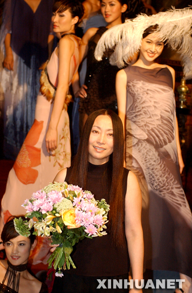 2004年7月7日,“东方印象——巴黎·中国时装周”在巴黎中国文化中心拉开帷幕,中国时装设计师吴海燕在作品展示后接受献花。